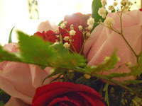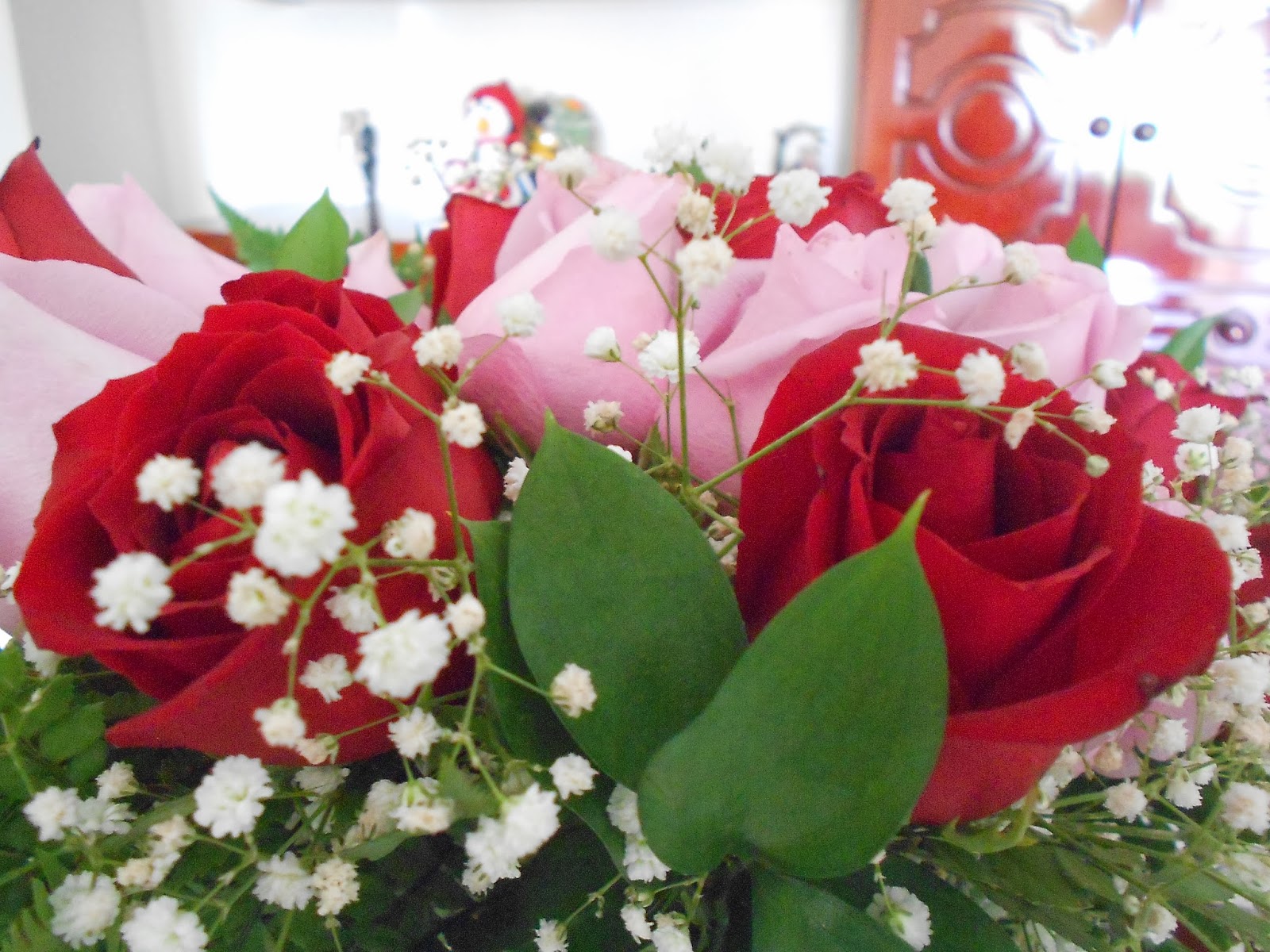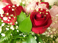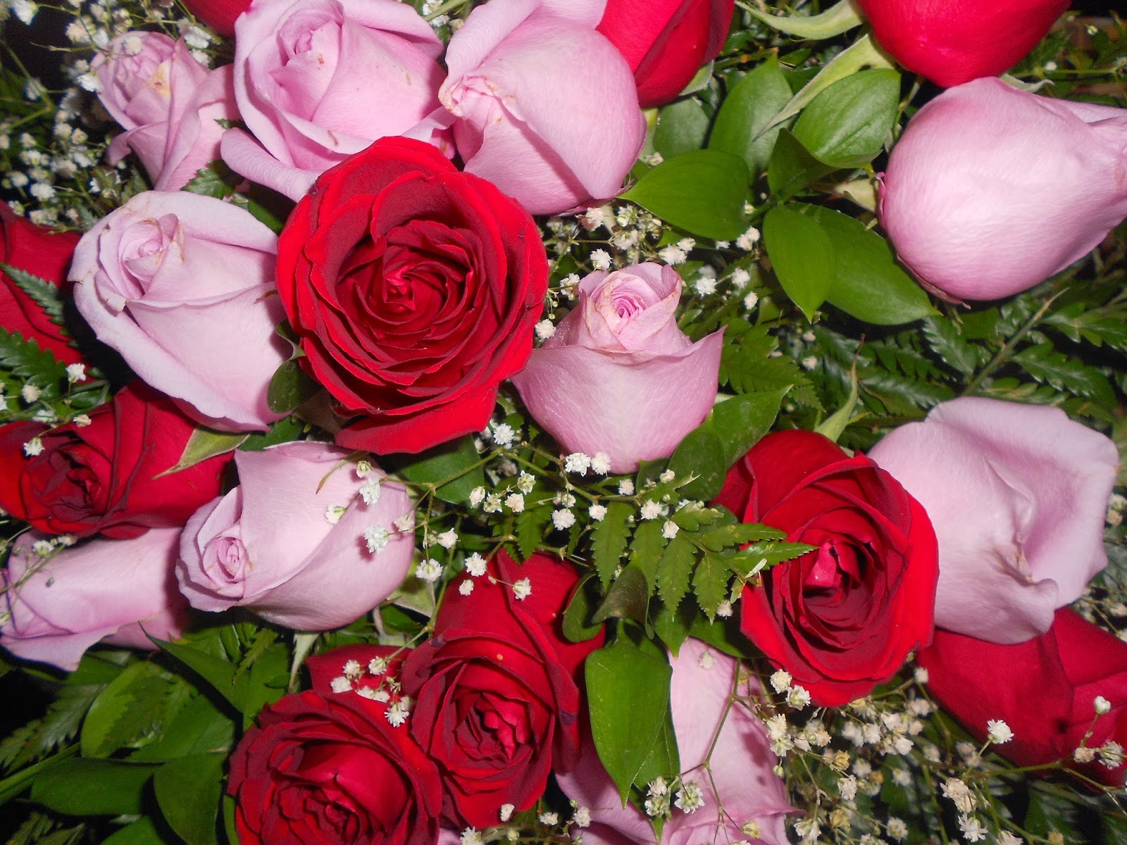 Eu recebi de surpresa e amei,é um buquê composto por roseiras vermelhas e rosas e se não me engano,acompanhadas das pequenas chuva de prata.